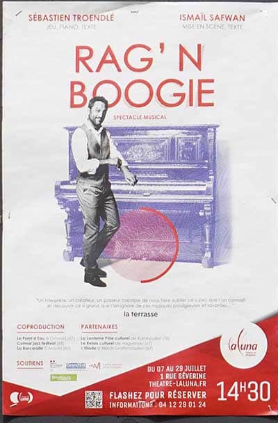 Au Off du festival d’Avignon, il y a du théâtre, beaucoup mais aussi des spectacles musicaux. C’est à l’un d’eux, intitulé « Rag’n’Boogie » que nous avons pu assister. En près d’une heure trente, le pianiste Sébastien Troendlé va nous raconter les débuts de la musique noire américaine et de celles et ceux qui les ont faits. De 1619, l’arrivée des premiers esclaves sur les terres nord-américaines jusqu’à la naissance du jazz avec Jelly Roll Morton son créateur auto-proclamé, à la fin des années 1920. Il commence sa narration en s’accompagnant d’un kalimba avant de vite rejoindre le piano droit avec lequel il va illustrer de façon magistrale, les différentes évolutions de cette musique qui va devenir le ragtime et le boogie-woogie. Cake-Walk, Minstrels ou rent-parties, les esclaves, les musiciens noirs s’échappent peu à peu de l’influence de l’église pour faire une musique moins spirituelle mais plus spiritueuse dans des Barrel Houses. Sur la droite de la scène des images d’archives, des dessins sont projetés pour mettre en lumière les propos et les notes du pianiste.