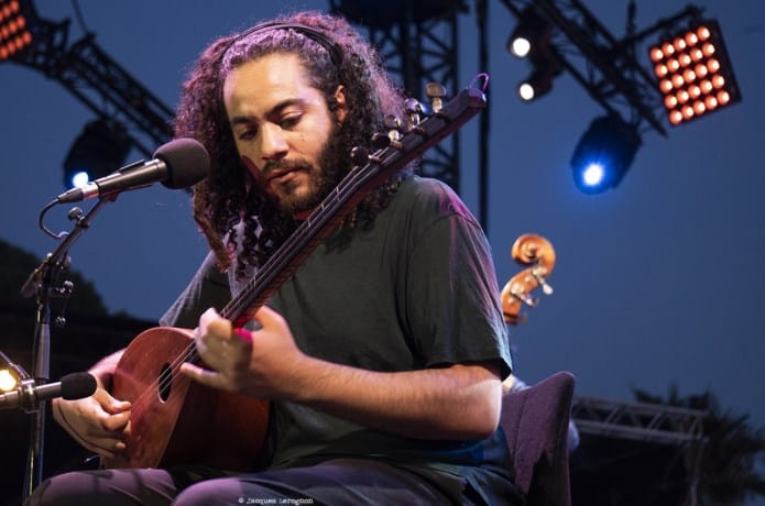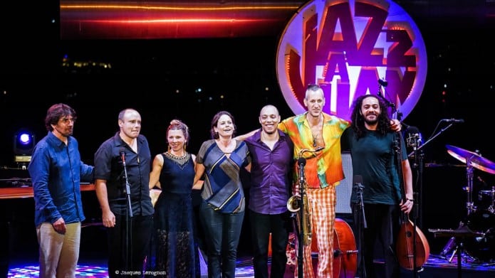 Un court entracte et Sophie Alour ténor en main foule la cène de la pinède. Elle est entourée d’une très belle équipe, celle de son dernier disque « Enjoy ». Abdallah Abozekry et son saz, Raphaelle Brochet au chant, Donald Kontomanou à la batterie, Damien Argentieri au piano, Philippe Aerts contrebasse, avec un invité spécial pour ce 14 juillet, le batteur Cyril Atef. Le septet nous fais voyager entre jazz et musique orientale, (les chorus de saz, les accords mineurs) ponctué par quelques gigues irlandaises alors que le chant de Raphaëlle Brochet, lui nous entraîne en pays Sindhu. Chaque inspiration amène ses strates pour bâtir une musique ambitieuse, enjouée, colorée.