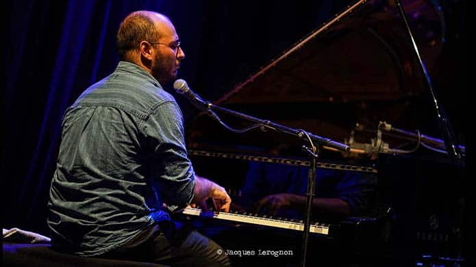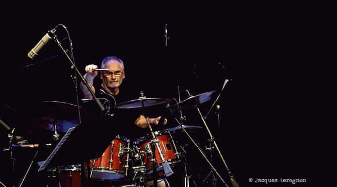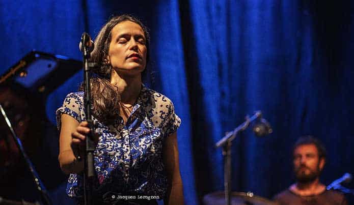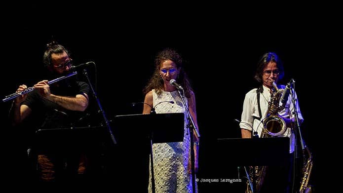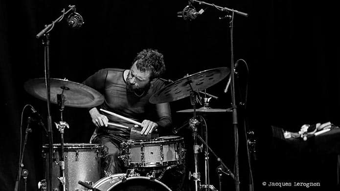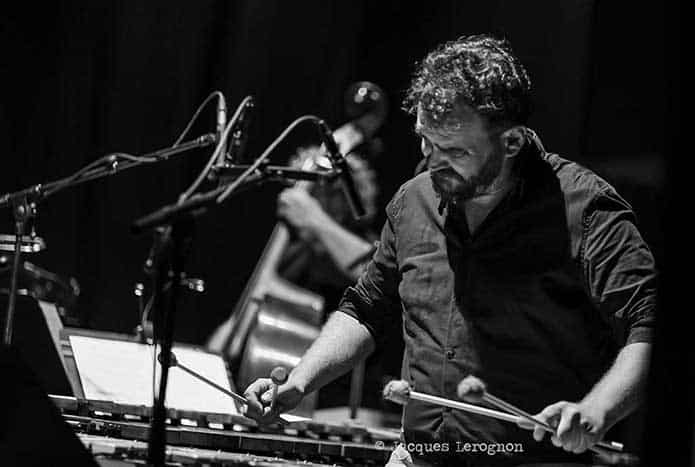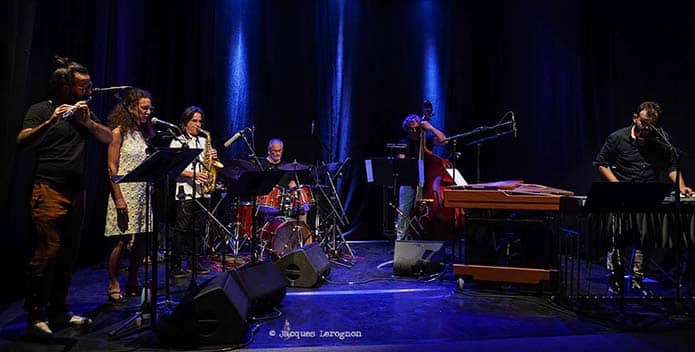 Le régisseur et son équipe ont bien bossé pendant la pause. L’espace sur la scène est bien occupé par un marimba et un vibraphone, une batterie, une contrebasse et trois pupitres pour le sextet de Jean-Pierre Julian. Le batteur-leader nous présente tout d’abord son projet intitulé « La Naissance du Soleil et de la lune », inspiré d’un conte aztèque. Dans un monde ancien, les dieux plongent dans les ténèbres créent le soleil et la lune pour donner de la lumière aux humains. Ainsi, il faut que les Dieux meurent pour que les hommes vivent. Hélas pas encore d’actualité. Musique. Les textes sont chantés par Christine Bertocchi en nahuatl, la langue autochtone d’Amérique latine quand elle n’improvise pas sur des sonales et autres onomatopées renforcées par les saxophones de Guillaume Orti ou la flute de Etienne Lecomte. Une musique très écrite qui évoque Frank Zappa dans les longues parties de vibraphone et marimba de Tom Pablo Gareil en dialogue avec le saxophone ou la contrebasse d’Éric Chalan. La forte présence de la batterie de Jean-Pierre Julian en contrepoint des effusions vocales de Christine Bertocchi (aussi impressionnante que virtuose) rappellent à certains le groupe Magma. Après tout les aztèques viendraient des environs d’Altaïr qui n’est pas très éloignée de Kobaïa dans la cosmogonie Zeuhl. Un set luxuriant, touffu, happant. On ne rentre pas facilement dans l’univers de Jean-Pierre Julian mais on y reste longtemps après la dernière note.