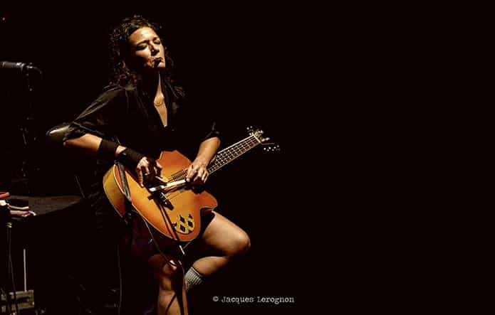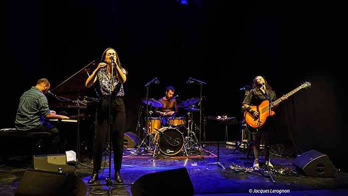 C’est le quartet « Haleïs » de Juliette Meyer qui ouvre ce second soir. Haleïs est un mot de vieux français signifiant “cri retentissant” nous explique la chanteuse et compositrice avant de laisser Fanny Lasfargues introduire le concert avec sa basse électro-acoustique pourvue d’un copieux set de pédales. Elle anime les cordes avec une étrange boule de métal, gardant son médiator entre les lèvres. Puis vient la voix, les voix. Benoit Joblot derrière sa batterie et Clément Mérienne au clavier se joignent aux deux jeunes femmes. Inspirées de textes médiévaux, les chansons qui se succèdent sont comme de longues plaintes où la voix de Juliette Meyer est propulsée par ses trois acolytes et leur instrument. La musique va du médiéval au contemporain, piano préparé, batterie accessoirisée, basse insolite voire baroque. La tonalité n’est pas joyeuse mais on rentre vite dans une espèce d’enchantement accentué par la gestuelle des musiciens. Les bras en croix ou les mains serrées autour du micro de la chanteuse, la concentration du batteur, les yeux clos qui se couchent sur ses toms comme le faisait, en son temps, Bill Evans sur son clavier. Mais aussi le pianiste qui plonge son corps dans le cadre du Yamaha pour jouer directement sur les cordes avec les doigts ou une baguette ou même un archet électronique. Fanny Lasfargues danse avec sa basse, descend, à genoux, triture ses boîtes à effets avant d’empoigner un archet pour stimuler les cordes. Les Émouvantes portent bien leur nom avec cet Haleïs !