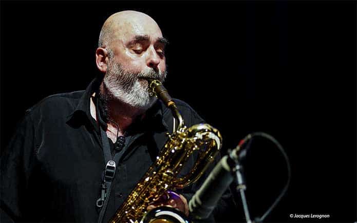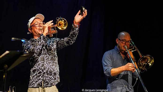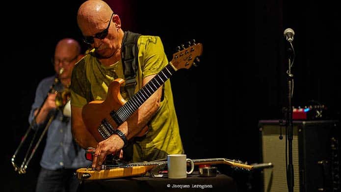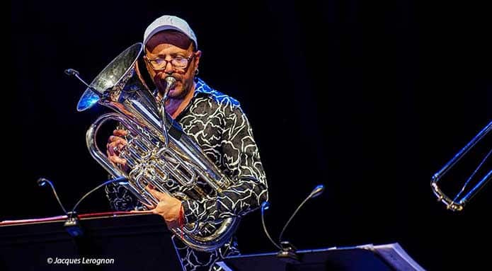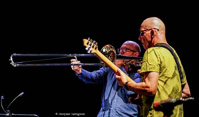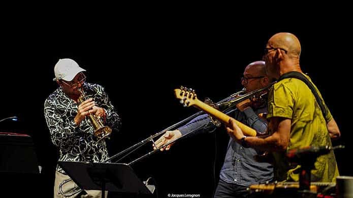 On profite un peu de la fraicheur extérieure avant de retrouver nos places et d’écouter enfin ce fameux quartet « Ici » dont on ne connaissait que la version discographique. Trois soufflants accompagnent la guitare de Marc Ducret. Christophe Monniot aux saxophones alto et baryton, Fabrice Martinez trompette, bugle, picolo et euphonium et Samuel Blaser au trombone. Le projet créé pendant le confinement se nomme Ici car à l’époque on ne pouvait pas aller là-bas, nous dit le guitariste, un sourire en coin. Une suite en quatre parties comme les quatre saisons nécessaires à la création de ce répertoire. Le compositeur-guitariste est aussi metteur en scène de sa musique, ses trois compères prenant le souffle tour à tour, ou en duo, ou bien en trio répondant en des feux d’artifice de couleurs, de timbres. Pas d’instrument rythmique mais celle-ci est assurée par une espèce nouvelle de basse continue entretenue par la guitare et le trombone ou par les graves de l’euphonium. Fabrice Martinez -as de l’embouchure- passant avec brio et aisance de la trompette picolo à son tuba ténor. Par instants Marc Ducret délaisse sa guitare principale pour une plus petite, de voyage, posée sur une table, qu’il joue en taping ou avec divers objets allant du mug au bottleneck en passant par une visseuse-deviseuse (un ebow version Casto) sous les vives attaques du baryton de Christophe Monniot ou les longues plaintes du trombone de Samuel Blaser. Rassurez-vous, il usera de sa guitare de façon plus naturelle en de longs solos distordus ou en arpèges scintillants. Un court rappel, presque une chanson sans parole, clôt ce concert mais pas la soirée car on peut retrouver les musiciens près du bar pour échanger impressions, ressentis.
