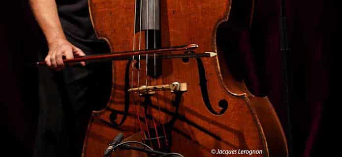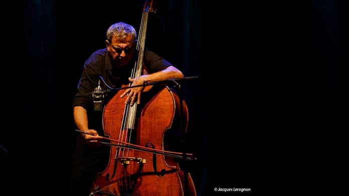 19h, on passe aux choses sérieuses avec In Spirit, le concert en solo de Claude Tchamitchian. Il nous présente en quelques mots son projet et la magnifique contrebasse sur laquelle il va jouer. Celle de Jean-François Jenny-Clark accordée pour l’occasion en Mib-La-Mib-La. Trois suites, la première en quatre parties permet à Claude Tchamitchian de développer ses idées rythmiques, son jeu à l’archet ou en « pizz » et ses improvisations. Il prend plus tard un second archet l’un sur le dessus des cordes, l’autre, simultanément, sur le dessous d’icelles afin de rappeler le son de la kamantcha, vieille arménienne. L’instrument de l’un de ses maîtres. Un set intense, il laisse parler sa main gauche sur toute la longueur du manche dans des doigtés parfois acrobatiques. La dernière pièce intitulée « Childhood » dédiée à tous les enfants du monde sera plus courte, plus tendre, moins tonique et presque malicieuse.