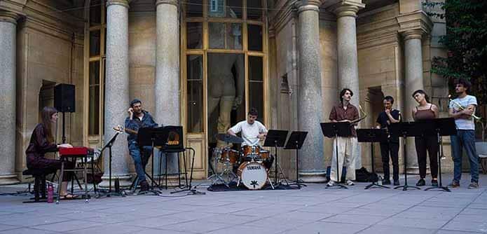 En prélude à la soirée, dans le très beau patio du conservatoire, on assiste à la restitution de la masterclass menée par Marc Ducret avec des élèves de la classe jazz. Six musiciens, deux trompettes, deux saxophones, clavier, basse et batterie ont travaillé des partitions du guitariste. Belle cohésion du groupe et malgré le trac un très beau solo de trompette et de sax alto.
