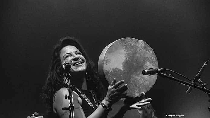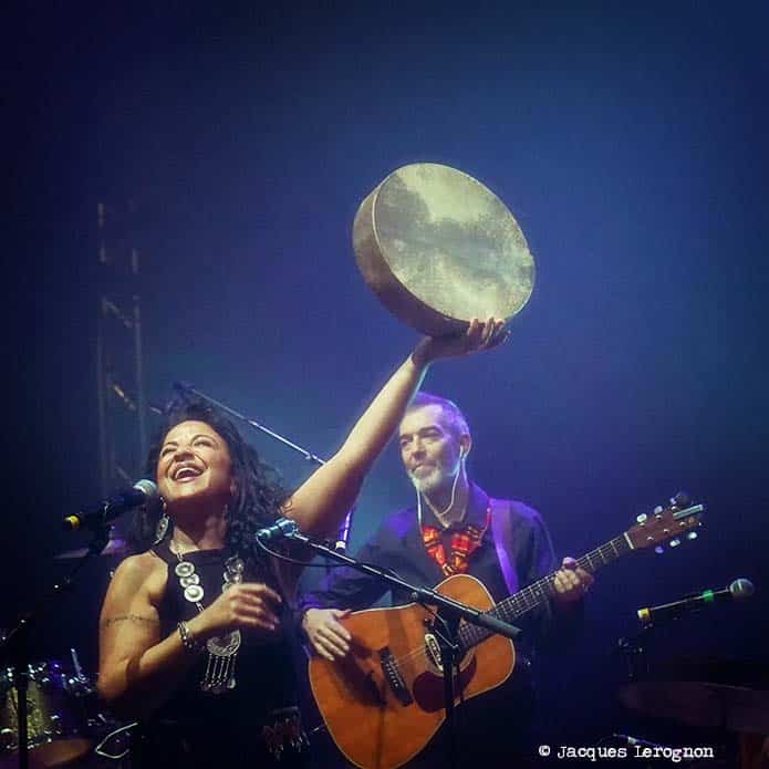 Deux groupes, deux chanteuses et compositrices pour une soirée consacrée à la musique orientale dans ce beau théâtre Lino Ventura. Une nouvelle formation pour Syna Awel, un trio acoustique avec Lucky Luc à la guitare et Mahir Bostandzija aux percussions. Un (trop) court set de cinq titres dans lesquelles Sina Awel se réapproprie, comme elle nous l’explique, ses origines berbères. Elle chante en Kabyle mais aussi quelques paroles en français et en anglais, la musique et la langue n’ont pas de frontière dans le cœur des spectateurs. Emportées par l’enthousiasme et le rythme des percussions, certaines descendent danser avec de profonds déhanchés devant la scène. Une valse pour commencer, les trois temps ponctués par la derbouka, le conte de l’âne Ari et pour conclure, l’une des plus belles du répertoire de Syna, « Mazel, Mazel » avec ses beaux arpèges de guitares et le solo façon oud. Tout le monde est debout, pas de rappel mais un court retour des quelques mesures. Bendir en l’air, grand sourire aux lèvres, la chanteuse et ses compagnons quitte la salle.