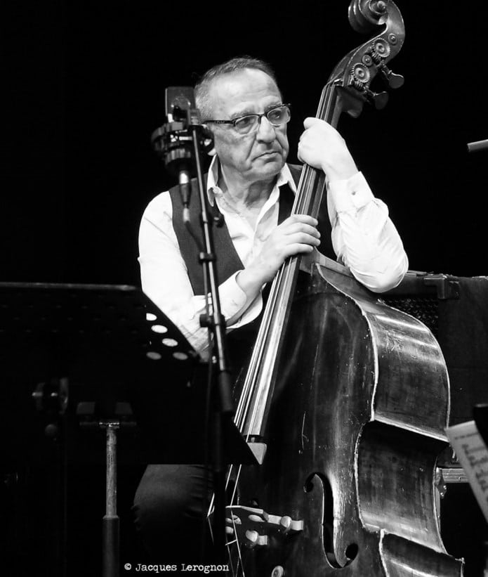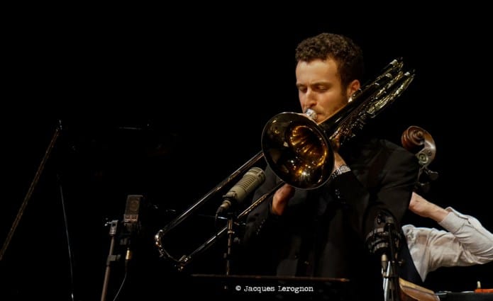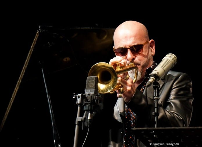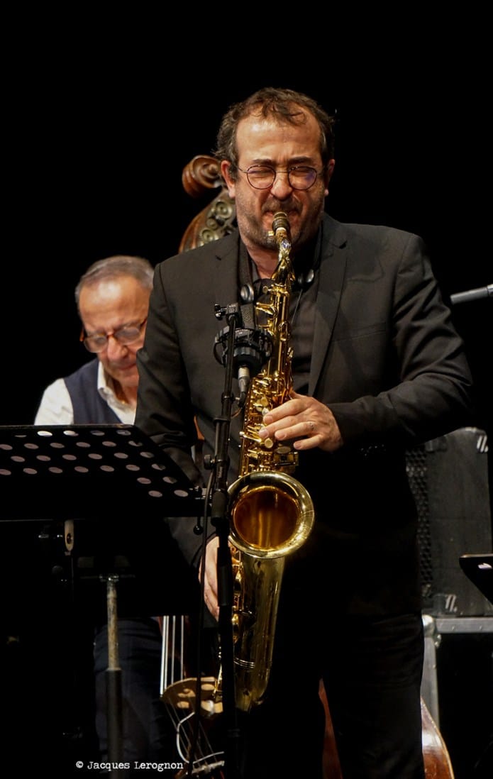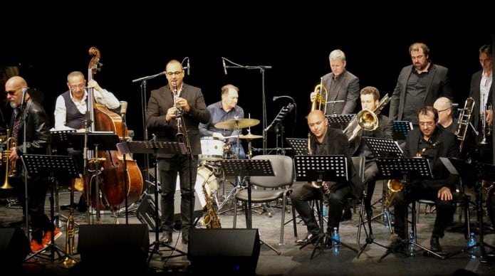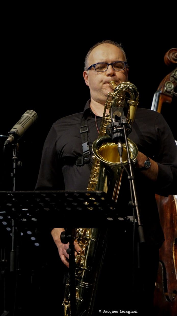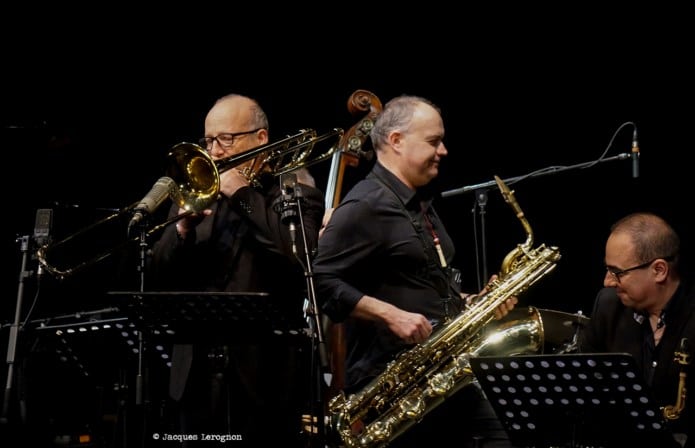Une fois tous les musiciens en place, ils sont douze à caser sur cette belle scène, le set débute avec « Bernie’s tune » popularisé par Gerry Mulligan. Pierre Bertrand, chef d’orchestre prend la parole,depuis le rang des saxophones, pour nous donner quelques indications sur le répertoire du jour. C’est à Stéphane Chausse que revient le rôle d’Art Pepper pour la soirée, nous indique-t’il. Et nous aurons droit à un très beau chorus dès le prochain thème « Walkin’ Shoes ». Pour le titre suivant, le trompettiste Stéphane Belmondo fera son entrée pour « Opus de Funk » composé par Horace Silver. Le big band continue d’égrener les chansons de ce fameux « + ELeven », Pierre Bertrand reprend la parole entre chaque morceau pour nous narrer une anecdote sur ce que l’on va entendre, sous le regard du bassiste (et directeur artistique) Christian Pachiaudi qui a l’air de se dire « Bon, on joue maintenant« . Et Pierre de chantonner deux ou trois mesures du thème avant de, par quelques claquements de doigts, donner le tempo. Fred D’Oelsnitz, en verve, nous offre une magnifique intro, suivit par un duo avec Belmondo avant l’entrée de tout l’orchestre. Marjorie Martinez rejoint le groupe pour nous interpréter trois succès d’Ella Fitzgerald, eux aussi arrangés par Paich. Beaucoup d’intensité dans son chant, bien propulsé par tous les cuivres (et bois). C’est l’heure de Parker, « Donna Lee » puis « Anthropology ». Les solistes se succèdent sur le devant de la scène, baryton, trombone, sax ténor et clarinette. Là encore, Stéphane Chausse envoûte le public.