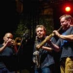 Les musiciens quittent la scène, les techniciens effectuent le changement de plateau avec une remarquable efficacité. Le dernier groupe peut prendre place, le Minino Garay Speaking Tango quartet. Cédric Hanriot au piano, Christophe Wallemme revient à la contrebasse et Manu Codjia à la guitare. Un set de Minino Garay s’est d’abord un spectacle, assis sur son cajon, derrière une batterie minimaliste, le percussionniste argentin va nous raconter, avec son chanté-parlé mêlant espagnol et français, le tango, son histoire, ses héros dont Carlos Gardel pratiquement sanctifié bien que né à Toulouse. Histoires d’amour tristes ou joyeuses, la toute belle Buenos Aires. Les magnifiques solos de guitares ponctuent souvent ces chansons ou anecdotes parfaitement rythmées par la contrebasse impériale de Christophe Wallemme. Le saxophoniste Baptiste Herbin arrive sur la scène à l’appel de Minino et d’un certain Carlito pour jouer un très bel arrangement de Smile, le tube de Charlie Chaplin écrit pour son film « Les temps modernes », au sax et au cajon. Un titre en hommage aux mamans suit avant que Nicolas Gardel, Sébastien Texier, puis Gautier Garrigue dans un habile passage de baguettes, rejoignent la petite bande pour un final explosif où les solos se succèdent, prélude à la jam session qui commence juste après la fin du concert. Peillon Jazz Festival c’est vraiment la fête!